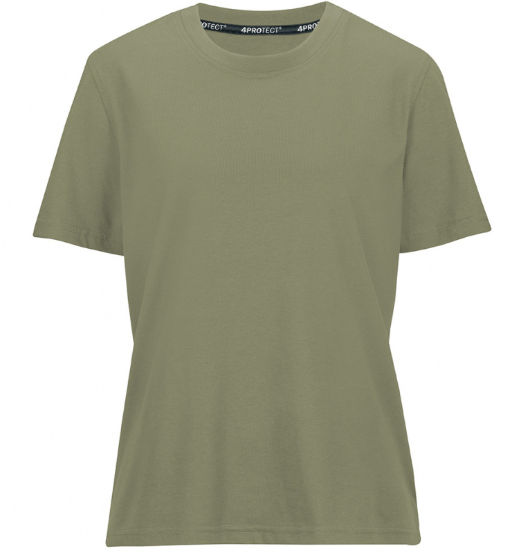 Damen T-Shirt in olive von 4PROTECT® Workwear. T-Shirt mit regulärer Passform, Rundhalsausschnitt und Kurzarm. Hergestellt aus Baumwolle gemischt mit Polyester für Form- und Farbstabilität, auch nach vielen Wäschen. Geeignet für die Industriewäsche nach ISO 15797. Mit Leasingkoller zur einfachen Kennzeichnung.
