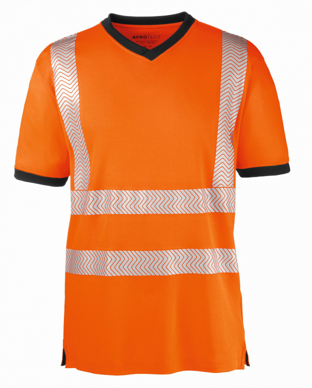 Oranges Warnschutz T-Shirt mit UV-Schutz in leuchtorange von 4PROTECT®. Zertifiziert für einen Schutz gegen ultraviolette Sonnenstrahlung. Auflaminierte, segmentierte Hosenträgerreflexstreifen erhöhen die Sichtbarkeit, sind dehnbar und engen den Träger daher auch in kleinen Größen nicht ein. TENCEL™ Lyocellfasern werden aus zertifizierten oder kontrollierten Holzquellen gewonnen, fühlen sich von Natur aus weich und geschmeidig an und unterstützen ein natürlich trockenes Gefühl durch Feuchtigkeitsregulierung. Die Produktinformationen sind im Nackenspiegel des Shirts direkt aufgeprintet. Auf ein kratzendes Etikett kann somit verzichtet werden. Bedruckung im maximalen Format möglich (z.B. 110 x 70 mm Brust und 260 x 100 mm Rücken), ohne einen abwertenden Einfluss auf die Warnschutz-Klasse. Ein gravierender Vorteil, wenn eine Personalisierung gewünscht wird.