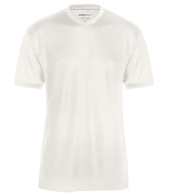 Weisses UV-Schutz T-Shirt in weiß von 4PROTECT®. Zertifiziert für einen Schutz gegen ultraviolette Sonnenstrahlung. TENCEL™ Lyocellfasern werden aus zertifizierten oder kontrollierten Holzquellen gewonnen, fühlen sich von Natur aus weich und geschmeidig an und unterstützen ein natürlich trockenes Gefühl durch Feuchtigkeitsregulierung. Es kühlt bei warmen Temperaturen, wärmt bei Kälte und kann 50 % mehr Feuchtigkeit aufnehmen als Baumwolle. Die Produktinformationen sind im Nackenspiegel des Shirts direkt aufgeprintet. Auf ein kratzendes Etikett kann somit verzichtet werden.