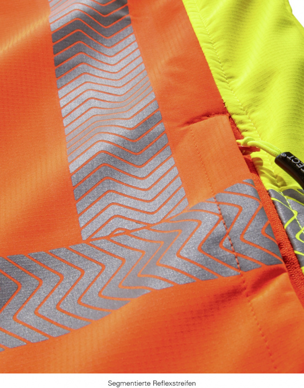 - Neuartige segmentierte Reflexstreifen, die direkt aufgeprintet werden, umlaufend um Körper und Ärmel sowie über die Schulterpartien (Hosenträgerreflexstreifen)