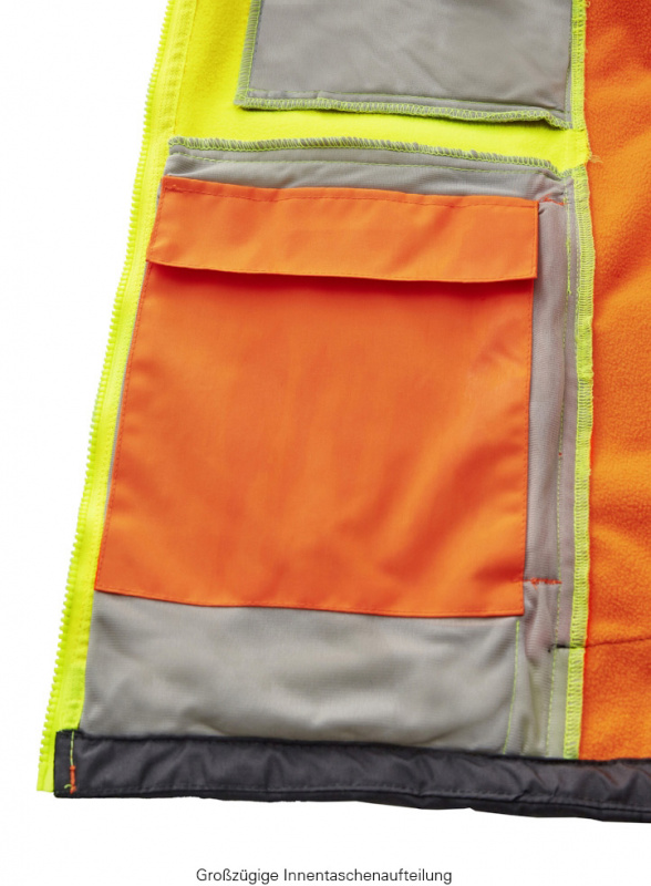 Orange Warnschutz-Softshelljacke von 4PROTECT® in leuchtorange/leuchtgelb. Sicher, cool und praktisch. Die Kombination der Warnschutzfarben bei der Jacke HOUSTON gibt ihr ein modernes Design. Sie trägt sich besonders angenehm durch die Verbindung von elastischem Gewebe mit körpernaher Schnittform und ergonomisch geformten Ärmeln. Neuartige, segmentierte Reflexstreifen, die direkt auflaminiert werden, laufen um Körper und Ärmel sowie über die Schulterpartien (Hosenträgerreflexstreifen) und sorgen für eine hohe Sicherheit und Sichtbarkeit. Eine sehr gute Atmungsaktivität und Wasserdichtigkeit des Gewebes, eine laminierte Funktionsmembran und die abzippbare Sturmkapuze schützen zuverlässig vor Wind, Regen und Kälte. Die robuste Ripstop-Gewebestruktur verhindert ein Weiterreißen und ist dadurch besonders langlebig. Dunkel abgesetzte, abriebfeste Besätze am Saum und Ärmelmanschetten schützen gegen Anschmutzen und Abstoßen. Diverse Verstaumöglichkeiten sowie eine aufwendige Innenverarbeitung sorgen für eine hohe Funktionalität im Arbeitsalltag.