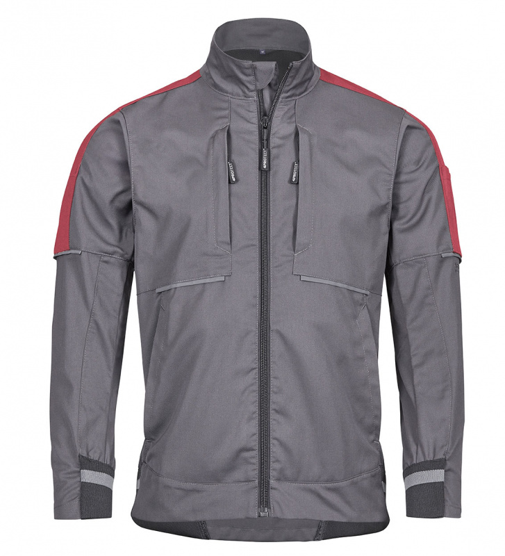 Grau rote Arbeitsbundjacke mit Elastikeinsätzen. Gefertigt aus Gewebe europäischen Ursprungs. Ergonomische Schnittführung mit Elastik-Einsätzen an Rücken, Bund und Manschetten. Diverse Taschen. Reflexelemente auf Front und Rücken. Innen mit Abstandsgewirk im Rücken für maximalen Tragekomfort. Unterlegter Front-Reißverschluss mit Zipper-Garage am Kinn. Hochwertige Marken-Accessoires. Arbeitsjacke geeignet für die Industriewäsche nach EN ISO 15797.