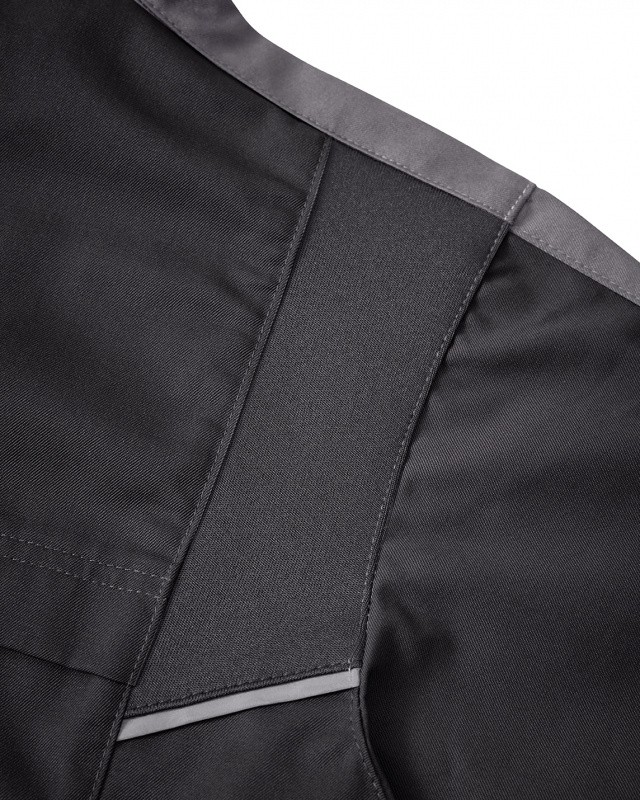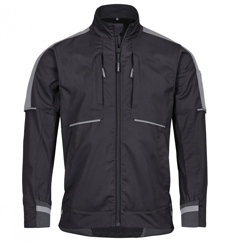 Schwarze Arbeitsbundjacke schwarz/grau mit Elastikeinsätzen. Gefertigt aus Gewebe europäischen Ursprungs. Ergonomische Schnittführung mit Elastik-Einsätzen an Rücken, Bund und Manschetten. Diverse Taschen. Reflexelemente auf Front und Rücken. Innen mit Abstandsgewirk im Rücken für maximalen Tragekomfort. Unterlegter Front-Reißverschluss mit Zipper-Garage am Kinn. Hochwertige Marken-Accessoires. Arbeitsjacke geeignet für die Industriewäsche nach EN ISO 15797.