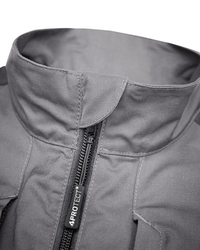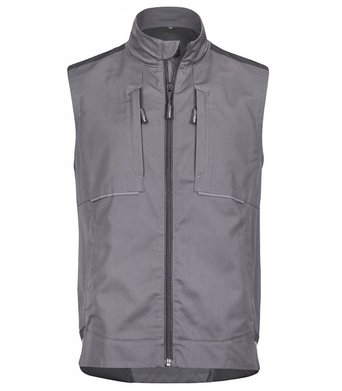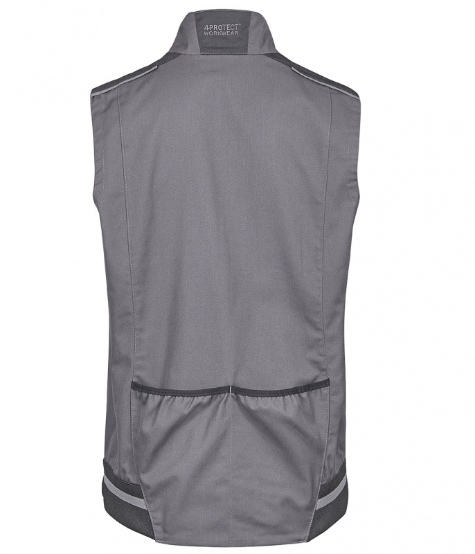 Graue Workwear Arbeitsweste von 4PROTECT® grau/schwarz. Gefertigt aus Gewebe europäischen Ursprungs. Elastischer Bundabschluss. Diverse Taschen, u.a. große Rückentasche mit 2 Fächern. Reflexelemente auf Front und Rücken. Unterlegter Front-Reißverschluss mit Zipper-Garage am Kinn. Hochwertige Marken-Accessoires. Arbeitsweste geeignet für die Industriewäsche nach EN ISO 15797.