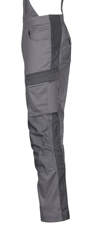 Graue PSA Workwear Arbeitslatzhose von 4PROTECT® in grau/schwarz. Hervorragender Tragekomfort dank des neuen Stretch-Gewebes europäischen Ursprungs. Ergonomische Schnittform, integrierte Hosenbeinverlängerung bis zu 5 cm. Besätze aus original CORDURA, diverse Taschen. Latz mit elastisch, verstellbaren Hosenträgern, die nicht rutschen. Elastische Einsätze am seitlichen Bund. Hochwertige Marken-Accessoires. Geeignet für die Industriewäsche nach EN ISO 15797. Kniepolstertasche zertifiziert nach der aktualisierten PSA-Norm EN 14404-3:2024.