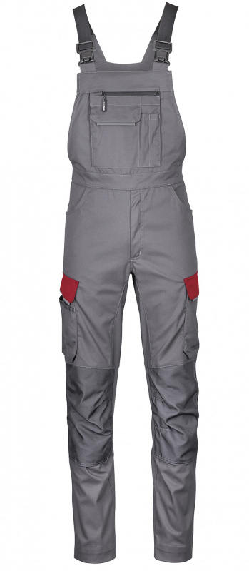 Grau rote PSA Workwear Arbeitslatzhose von 4PROTECT® in grau/rot. Hervorragender Tragekomfort dank des neuen Stretch-Gewebes europäischen Ursprungs. Ergonomische Schnittform, integrierte Hosenbeinverlängerung bis zu 5 cm. Besätze aus original CORDURA, diverse Taschen. Latz mit elastisch, verstellbaren Hosenträgern, die nicht rutschen. Elastische Einsätze am seitlichen Bund. Hochwertige Marken-Accessoires. Geeignet für die Industriewäsche nach EN ISO 15797. Kniepolstertasche zertifiziert nach der aktualisierten PSA-Norm EN 14404-3:2024.