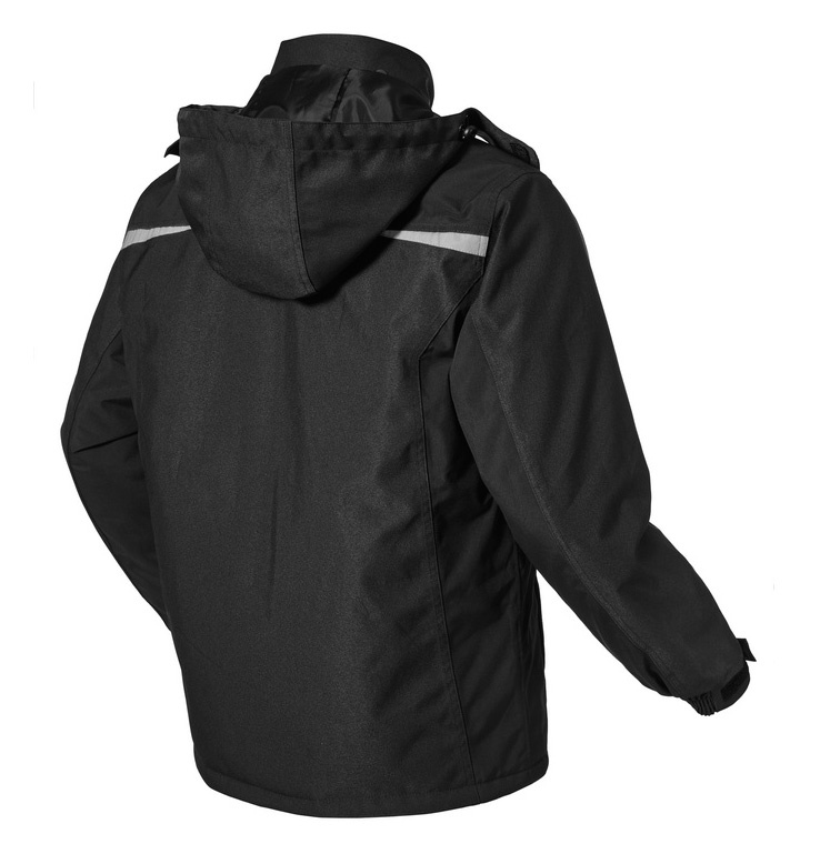 Schwarze Winterjacke Herren von New Pionier. Kollektion: Business. Mit reflektierendem Reißverschluss an Brusttaschen, Reflexkeile an Passe auf Vorderseite sowie auf Rücken, vieler nützlichen Taschen und angenähter einrollbarer Kapuze.