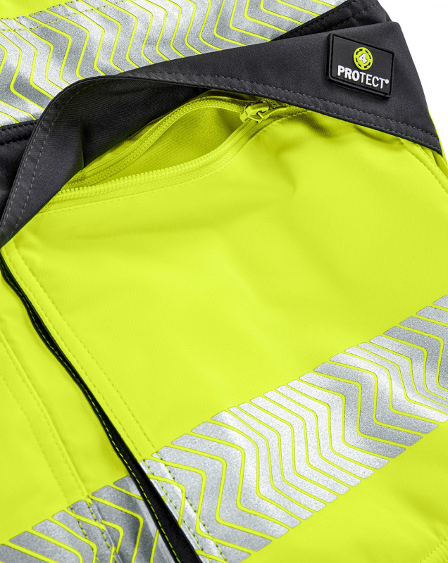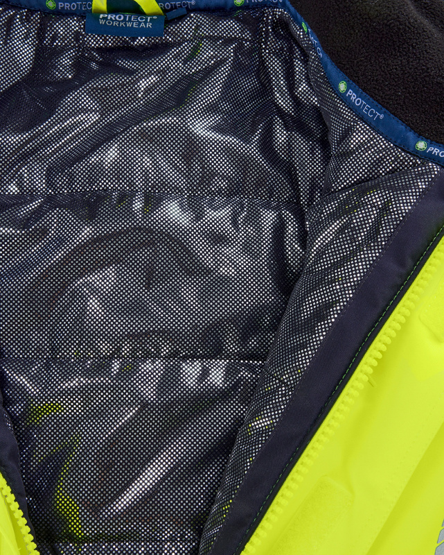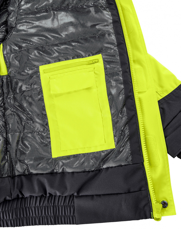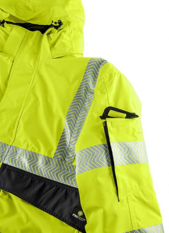 Gelbe Warnschutz-Wetterschutz-Blouson von 4PROTECT® in leucht-gelb. Einsetzbar bei allen Gefahren durch eingeschränkte Sicht schützt der Blouson NEWARK mit seiner wind- und wasserdichten PTFE-Membrane auch vor schlechtem Wetter. Mit dem extrem leichten und atmungsaktiven 4PROTECT®HEATING-Lining in Kombination mit der Fellex® Fast Heat Insulation Wattierung, bleibt die Kälte außerhalb des Blousons. Eine hohe Atmungsaktivität gestattet zudem eine lange Tragedauer. Unterstützt wird dies durch funktionelle Details, wie einem doppelt abgedecktem Front-Reißverschluss sowie einer abzippbaren Sturmkapuze mit diversen Verstell-Optionen. Der dunkel abgesetzte Saum- und Manschettenbereich schützt vor schneller Verschmutzung und die abnehmbare ID-Tasche bietet eine durchdachte Funktionalität. Zudem bietet NEWARK durch einen Service-Reißverschluss die unkomplizierte Möglichkeit der Bedruckung in unterschiedlichen Formaten (z.B. 100 x 50 mm Brust und 150 x 100 mm Rücken), ohne einen abwertenden Einfluss auf die Warnschutz-Klassifizierung.