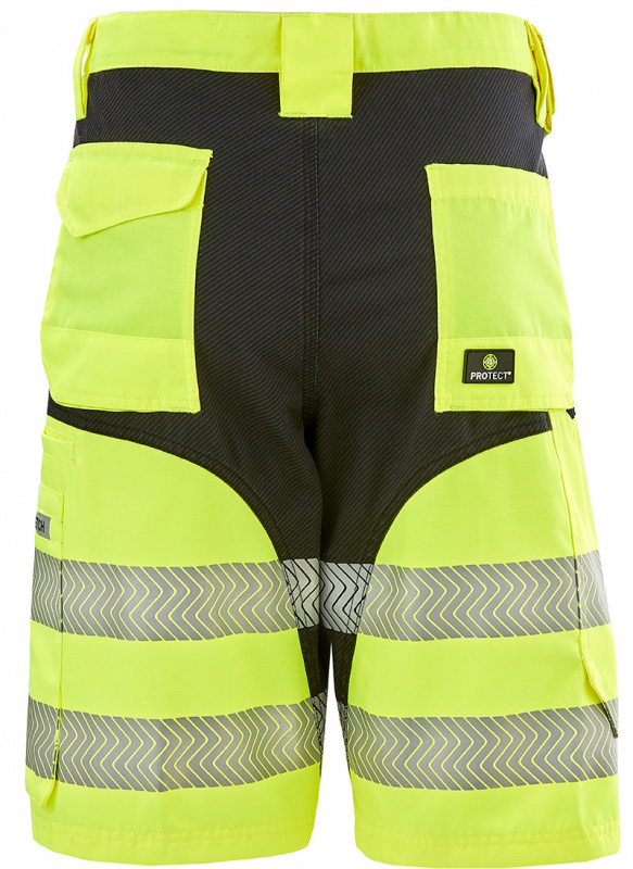Gelbe Warnschutz-Shorts gelb PATERSON 4PROTECT® leuchtgelb. Ein mehr an Bewegungsfreiheit, Sicherheit und Tragekomfort. PATERSON bietet dank ergonomischer, körpernaher Schnittform in Verbindung mit Stretch Einsätzen einen sehr hohen Tragekomfort. Segmentierte, auf laminierte Reflexstreifen umlaufen die Hosenbeine der Shorts und sorgen für hohe Sicherheit bei schlechten Sichtverhältnissen oder Dunkelheit. Dunkel abgesetzte Besätze am Hosenboden verhindern leichtes Anschmutzen, verstärkte Bereiche an Taschenböden sorgen für eine lange Haltbarkeit. Zahlreiche Verstaumöglichkeiten sowie durchdachte Details wie z. B. Zollstocktasche und Hammerschlaufe zeugen von einer hohen Funktionalität.