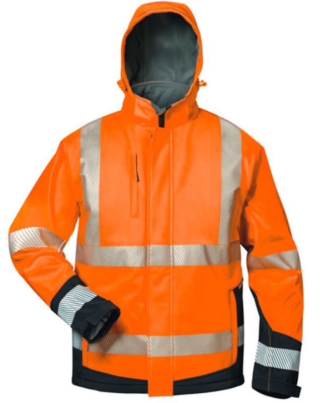 Orange Warnschutz-Winter Softshell Jacke mit Kapuze, orange/schwarz.