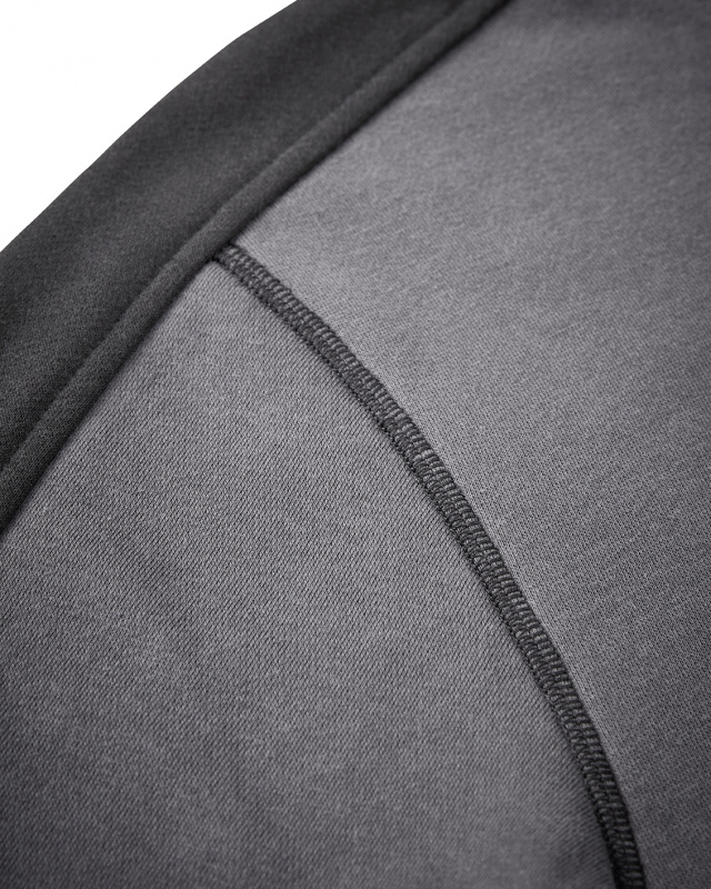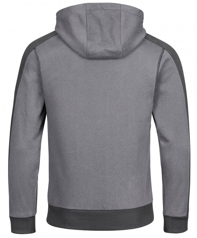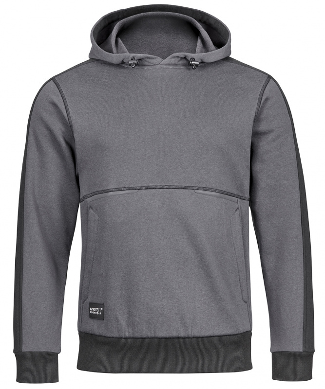 Grauer Kontrast Hoodie in grau/schwarz von 4PROTECT®. Hergestellt aus trageangenehmer Baumwolle mit stabilisierendem Polyesteranteil aus recycelten Fasern. Aufgeraute Innenseite. Känguru-Taschen auf der Front, angesetzte Kapuze. Elastische Manschetten und Abschluss-Bündchen. Geprägter Logo-Druck auf der Brust.