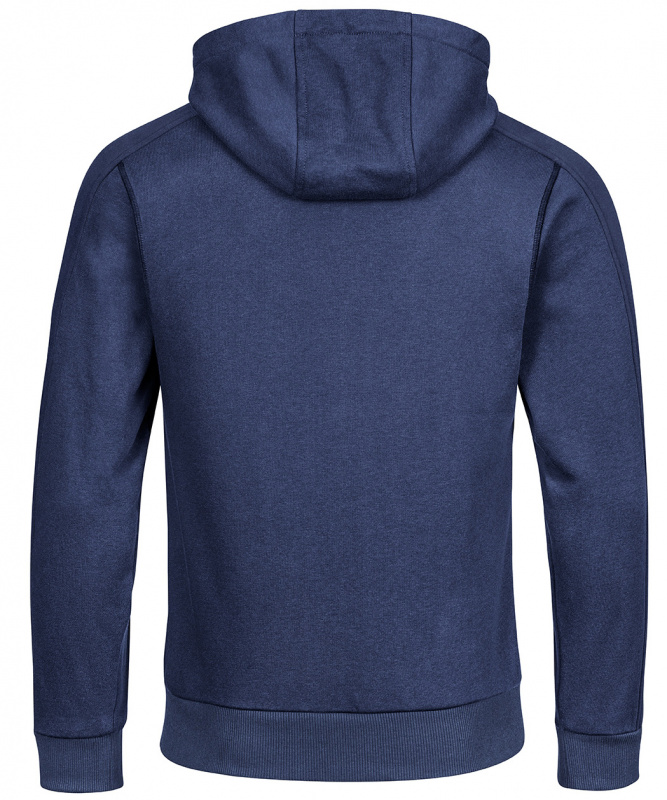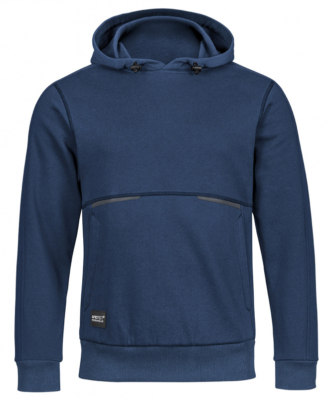 Kontrast Hoodie in navy/navy von 4PROTECT®. Hergestellt aus trageangenehmer Baumwolle mit stabilisierendem Polyesteranteil aus recycelten Fasern. Aufgeraute Innenseite. Känguru-Taschen auf der Front, angesetzte Kapuze. Elastische Manschetten und Abschluss-Bündchen. Geprägter Logo-Druck auf der Brust.