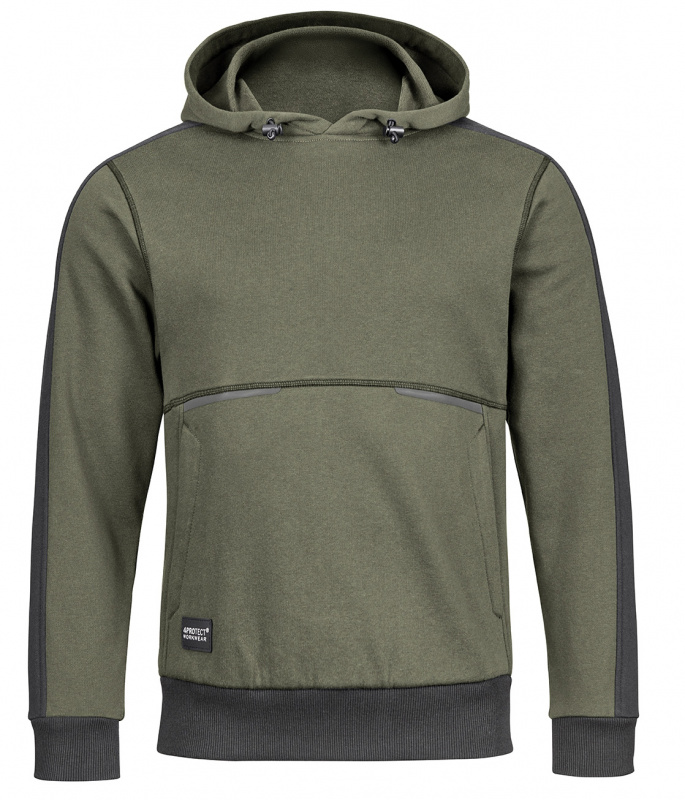 Olive schwarzer Hoodie in olive/schwarzvon 4PROTECT®. Hergestellt aus trageangenehmer Baumwolle mit stabilisierendem Polyesteranteil aus recycelten Fasern. Aufgeraute Innenseite. Känguru-Taschen auf der Front, angesetzte Kapuze. Elastische Manschetten und Abschluss-Bündchen. Geprägter Logo-Druck auf der Brust.
