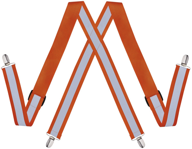 Warnschutz-Hosenträger in Warnschutzfarbe fluoreszierend-orange 4PROTECT® mit reflektierendem Print, gefertigt aus elastischen Bändern für maximalen Komfort. Einstellbar auf die gewünschte Länge und ausgestattet mit vier Metall-Clips, die für sicheren Halt an jeder Hose sorgen. Die Clips sollten möglichst an einer verdickten Stelle des Hosenbundes befestigt werden (z.B. an den Gürtelschlaufen).